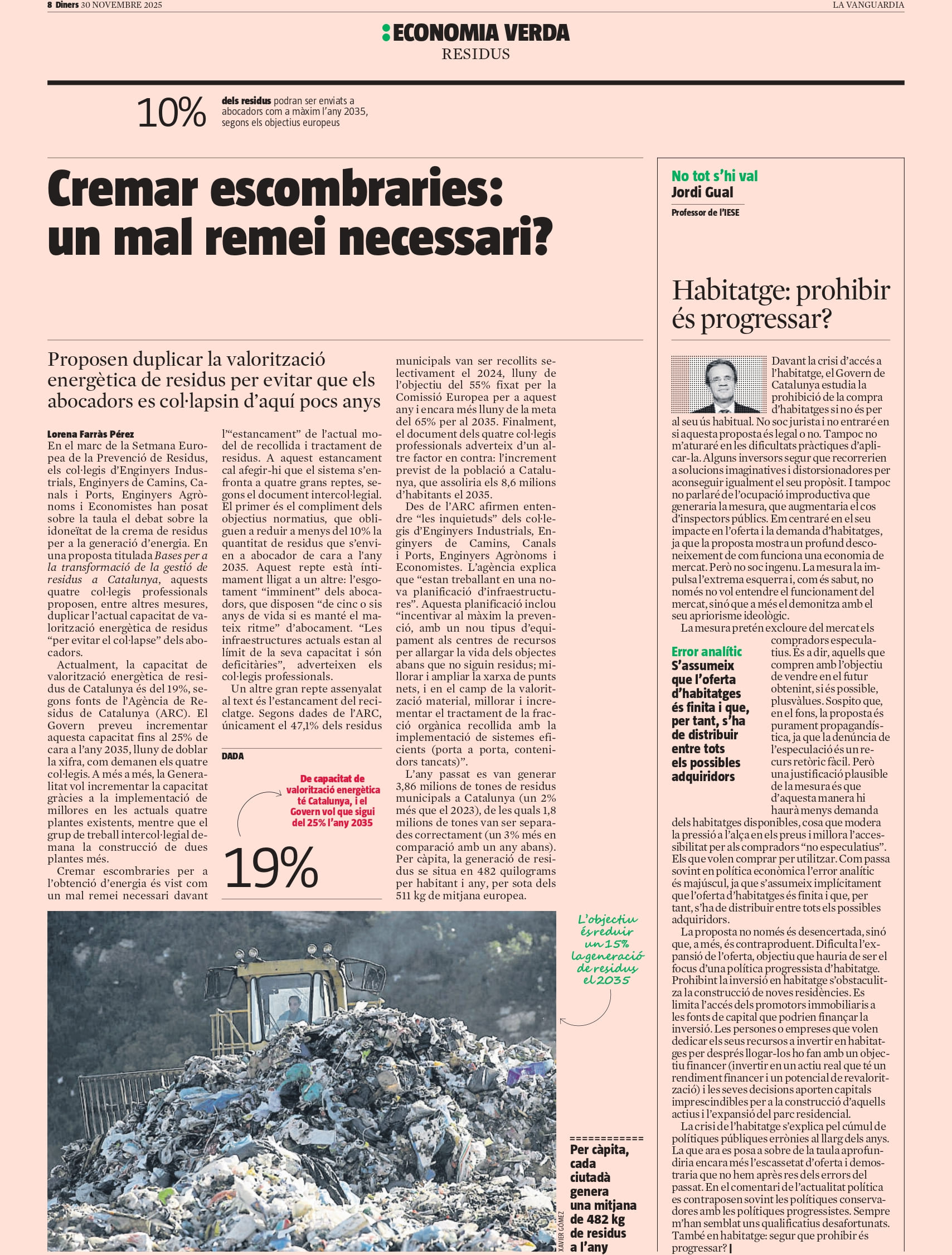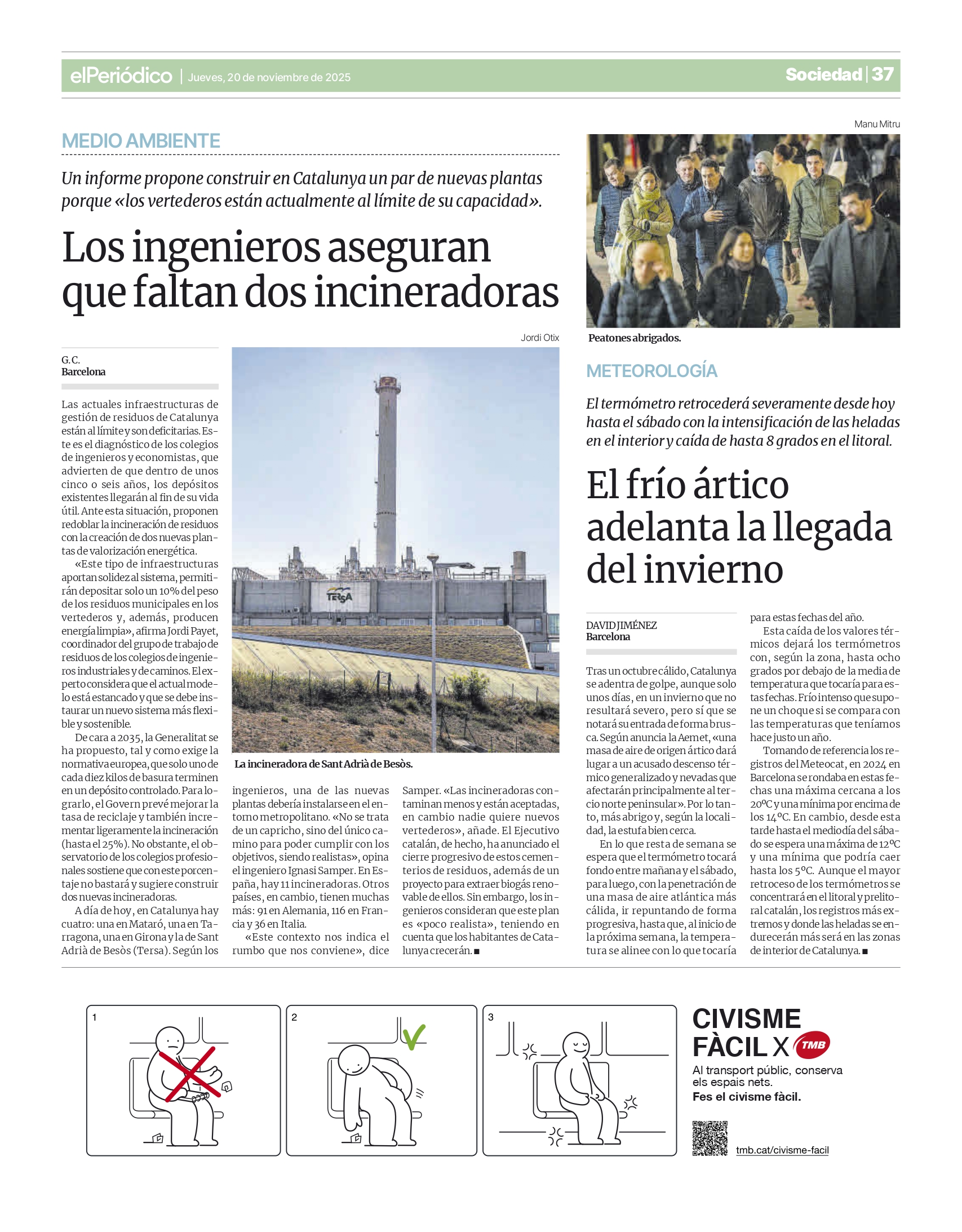 El document de ‘Bases per a la transformació de la gestió de residus a Catalunya’, presentat el novembre pel Grup de Treball Intercol·legial de Residus (que conformen el Col·legi d’Enginyers Industrials de Catalunya, el Col·legi d’Enginyers de Camins, Canals i Ports, el Col·legi d’Enginyers Agrònoms i el Col·legi d’Economistes) ha tingut una notable repercussió mediàtica. El document alerta del risc de col·lapse del sistema actual de gestió de residus i la necessitat de pensar les infraestructures necessàries tenint en compte que Catalunya podria arribar als 8,6 milions d’habitants el 2035 cosa que pot suposar 4,70 milions de tones de residus municipals anuals.